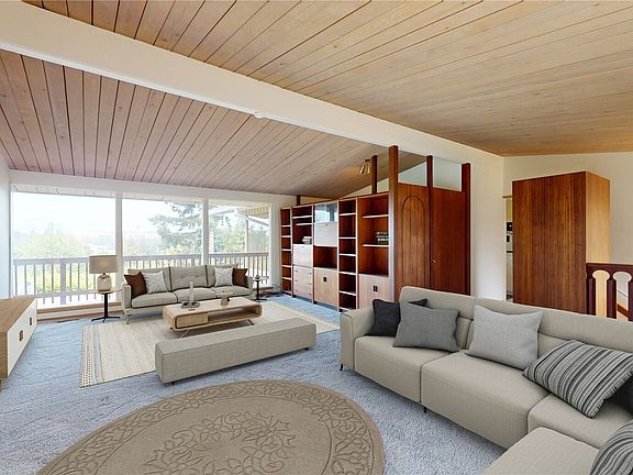Welcome to this peaceful neighborhood with clear views of Mount Rainier and the Cascades from the spacious dining and family rooms! A lovely water feature greets you at the entry. This popular Mid-Century Modern home offers a newly updated lower-level MIL suite with full kitchen, laundry, and direct access to a large patio. Features include a heat pump, central vacuum, fireplaces up and down, hardwood floors under carpeting, and a charming wood stove. The fully fenced backyard showcases established roses, fruit trees, and a playhouse, with covered RV parking along the south side. An oversized heated two-car garage includes EV charging, plus an additional carport. Offered by the original owners, this home is ready for new memories!