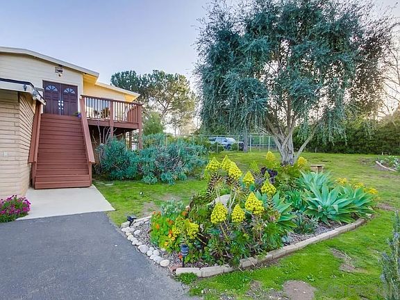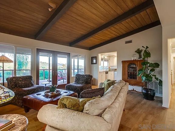 This Green Valley home features incredible mountain views on a 1.13 acre usable, flat lot with limitless options and plenty of room to add on additional structures. As you enter the front door of this beautiful home you will be in awe of the spectacular views from the family room which offers high wood beam ceilings, a fireplace and wood like luxury vinyl flooring. The kitchen and dining area opens to indoor/outdoor space where you can take in the breathtaking views from the expansive balcony. Downstairs are additional bedrooms and a den with an additional fireplace. Very private location with a gated entry. This home also features a three car garage and ample room on the property for additional vehicles, rv, etc...whatever toys you have, this property can accomodate. No Mello Roos, No HOA and close to Poway schools, a whole house water filtration system and low water, native plant landscaping. A wonderful property to call home!