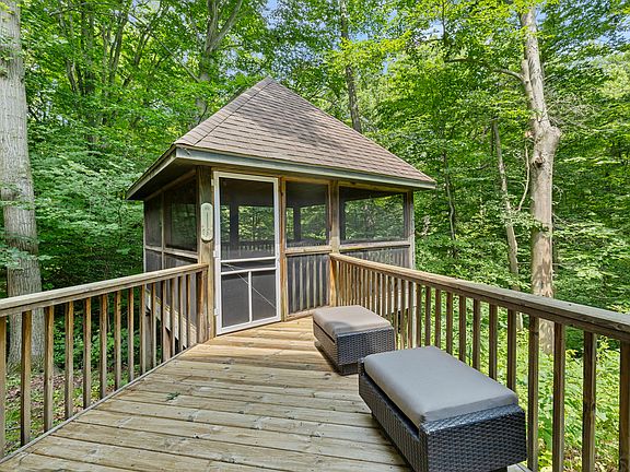 Mother Nature's woodland glory surrounds you here, and you and your guests will be able to revel in it to your heart's content. From the casual comfort of the nicely furnished front porch to the wraparound deck out back to the outside-access screened porch beautifully furnished with a set of posh, yet super-comfy rattan chairs and a matching table, plus spectacular views of the woods and ravine you'll be living large and enjoying 'the good life' whenever you step outside! And with the huge fenced front yard, children will be delighted, as well.