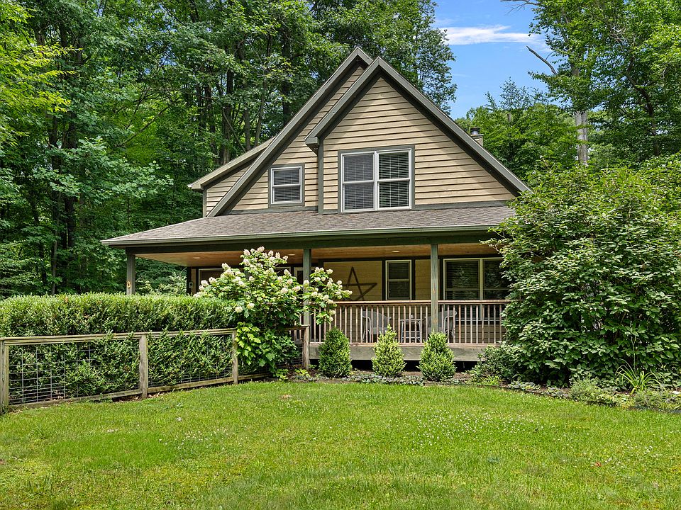 This FULLY FURNISHED home is set on 1 acres of woodland beauty! Relax in the spacious open-design LR-DR-Kitchen, taking in the cathedral ceilings, majestic fireplace, and fabulous views. Or catch a movie on a flat-screen TV. Gorgeous bedrooms and chic bathrooms add elegance to the mix, and with 2 screened porches (1 overlooking a ravine), a huge fenced yard, a large deck, and a gas grill, the Great Outdoors is yours! Near beaches and amenities galore.