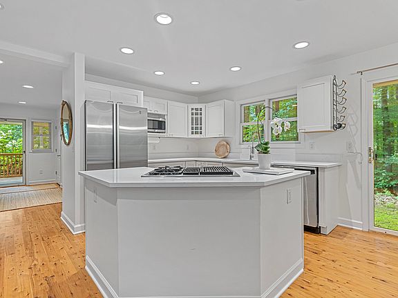 Time to watch a fav movie or show? We've got you covered with a flat-screen TV both in the living room and in one of the upstairs bedrooms. Anyone hungry? The Chef's Kitchen is fully equipped and ready for making scrumptious meals or snacks. High-end stainless-steel appliances, all sorts of cookware and utensils, Carrera quartz countertops, a professional stovetop set in the center island, and even a Keurig coffeemaker to satisfy those with a hankering for primo joe! And there's a sweet 6-chair dining table with great woodsy views.