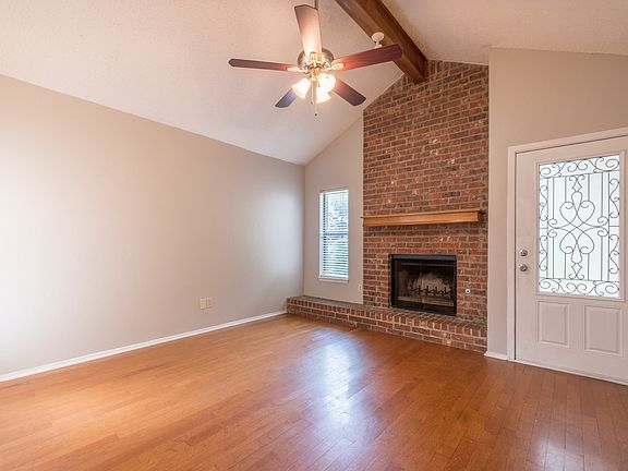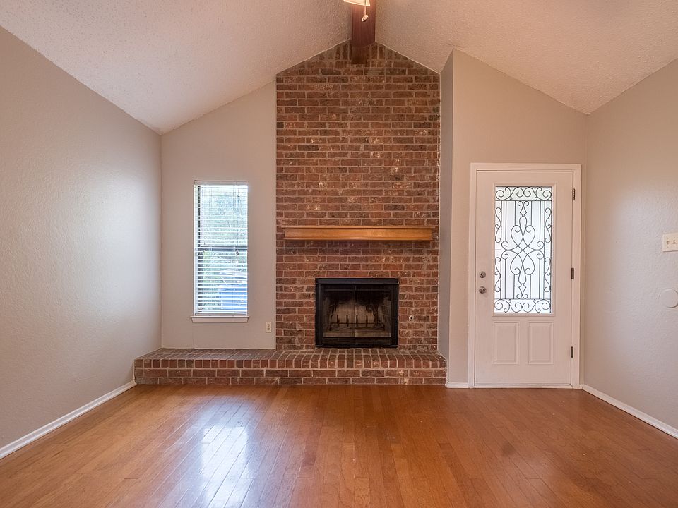 Classic brick fireplaceFresh interior paintWarm wood flooringAttached one-car garageInviting living spaceSleek stainless steel appliancesVaulted ceiling