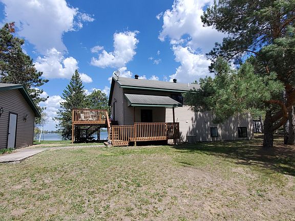 Escape to breathtaking beauty with this stunning lakeside retreat offering 187 feet of pristine waterfront. Enjoy panoramic views, mesmerizing sunsets, and a sandy swimming hole perfect for summer fun. Whether you're fishing in the tranquil waters or soaking in the peaceful scenery, this quiet lake delivers the ideal getaway. 5 Car Garage a plus for all the "toys". Inside, nearly every room boasts expansive lake views, creating a seamless connection between indoors and outdoors. The main floor living area features multiple walkout doors leading to a wraparound deck, perfect for lakeside entertaining. The walkout lower level leads directly to the shore and includes an amusement room with a small kitchenette—ideal for hosting guests.