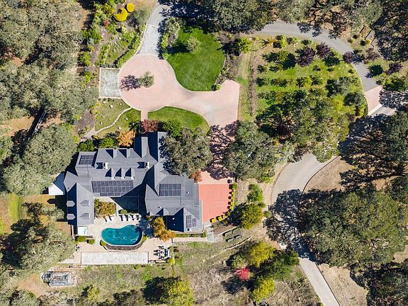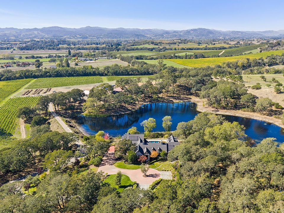 Behind gates and oriented to lake and vineyard vistas, this elegant estate pairs resort-style amenities with space to cultivate your own Wine Country lifestyle - think gardens, orchard, and room for animals - minutes from acclaimed wineries, dining, and luxury amenities. Inside, a chef's kitchen with large island and dual pantries opens to a vaulted dining room with fireplace. The living room's open-beam ceilings and dramatic fireplace frame wall - length accordion doors that blend indoors and out. Down a spiral stair, a wine cellar adds true Wine Country character. On the main floor, the primary wing offers a suite with fireplace, walk-in closet room, steam shower, soaking tub, plus a sunroom ideal as a gym or studio stepping out to the pool and hot tub. A main-floor office with full bath adds flexibility. Upstairs, two ensuite bedrooms take in hillside and vineyard views. Outdoors, enjoy a built-in BBQ kitchen, covered dining patio, bocce court, pool, hot tub, raised garden beds, and substantial orchard. Equestrian amenities include run-in shed, pasture, tack room with electricity and water, and access to nearby riding trails. Roughly 1hr from the Golden Gate, & 10min to Healdsburg square & the airport, your private Wine Country retreat offers every comfort close at hand.