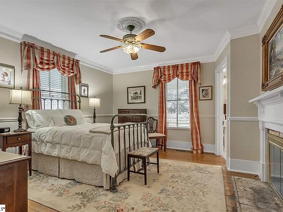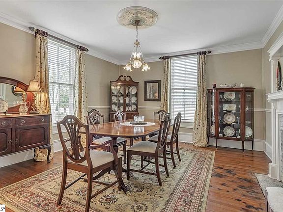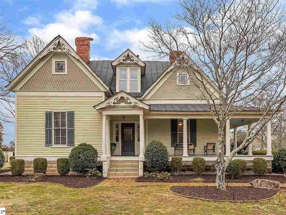 Let me take you back...to a simpler place and time. This gorgeous Victorian style estate exudes all that you could want in peace and tranquility. Nestled on 2.4 acres, this exquisite historical masterpiece was originally built in 1887 and was the first "manse" or pastors home of Fairview Presbyterian Church. Over the years, this home has undergone loving restorations and renovations, while managing to retain some of the original details along side modern luxuries. Driving past the old stone wall out front, you immediately begin to recognize that this is no ordinary place. Turning onto the gravel drive, you are warmly greeted by a gentle breeze and the calming salute of mature cedars, along with a 2 car detached carriage house garage w/storage loft. As you walk up towards the front door, you will find yourself immersed in thought as your eyes fixate on a marvelous front wrap around porch that boasts of "Haight Blue" bead board ceilings and surrounded by mature, professional landscaping. Up the steps, your eyes will be drawn to a magnificently sealed and stained hardwood front door. Once inside and standing in the huge foyer, your eyes are drawn to years gone by, with original wide board, "heart of pine" hardwoods, bead board wainscoting & hand blown glass panels. Continuing on the main level, you will find an array of expansive formal dining rooms, (2) spacious family rooms(one being used as an office), a casual breakfast room with built in china hutch and a master bedroom with en suite bath. All of these rooms currently have stunning, non-working fireplaces and spectacular mantels. The renovated kitchen boasts of hand selected granite counter tops, custom cherry cabinets, Sub-zero refrigeration and a Thermadore stainless steel gas range with convection oven and heating lamps for the stove. Heading upstairs, you will start up an original staircase with hardwood treads and end begin your tour of the upstairs living quarters. There are 4 spacious and charming bedrooms, each with their own bit of character. Two of the bedrooms share a bathroom, while 2 other bedrooms are en suite and 1 could be considered as a second master. there is also walk in storage, tons of closets and a large, closet style walk in laundry room with sink. Heading back downstairs and out the back door, you will notice that the front and back doors align so that when open at the same time, a gentle breeze moves through the home and fills the house with springtime flowers from the garden. Outside on the back porch or picket-fenced brick paved patio, you can sit and enjoy the delight of birds singing, all the while enjoying cooler temperatures and splendid sunrises or sunsets. Be entertained by extraordinary family occasions and peace of mind in this spectacular, historical showpiece, deeply tied into Fountain Inn's history. YOUR MOMENT IN TIME AWAITS YOU! WITH NO RESTRICTIONS, THIS HOME & ADDITIONAL ACREAGE COULD BE USED AS A COMMERCIAL PROPERTY!!