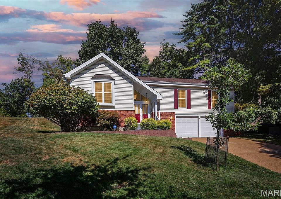 Tucked away on a quiet cul-de-sac, this impeccably maintained home sits on nearly a half-acre lot that extends into the woods and backs directly to Love Park - offering rare privacy and a natural setting. Step inside to find soaring vaulted ceilings in the family room and kitchen, hardwood floors in the family and dining rooms, and a bright bay window framing the gas fireplace. The eat-in kitchen features neutral counters, white cabinets, some updated appliances, and a slider that opens to the expansive backyard. The spacious master suite boasts a walk-in closet and a luxurious en suite bath with separate jetted tub and shower, adult-height double vanity, and heated tile floors. A second updated full bath serves the main floor, while the finished lower level offers even more living space with a gas fireplace, rec area, and a flexible sleeping/office nook. Additional highlights include a formal dining room, a 5-year-old HVAC system, and a two-car garage. Located within award-winning Parkway Schools and close to Cool Dell pool for summer fun, this home combines comfort, convenience, and an unbeatable setting.