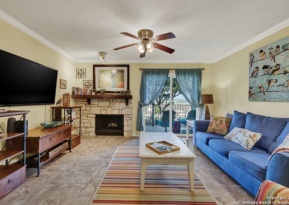 Charming 1-bed, 1-bath condo at Canyon Lake, your slice of Hill Country tranquility! Perfect as a serene getaway or lucrative investment with overnight rental potential. Tastefully updated with fun decor, this downstairs corner unit offers privacy and quiet. Features a cozy fireplace, large flat-screen TV, and a kitchen with refrigerator, microwave, 2 convection ovens, stovetop and dishwasher. The private bedroom is tucked away, plus a memory foam sleeper sofa for guests. Step through the sliding glass door to a private balcony with wrought iron gate, overlooking a peaceful lawn and Canyon Lake views. Enjoy frequent wildlife visitors! Hiking trails at the Madrone Trail just the next peninsula over with other hiking options not far. Amenities include an on-site laundry facility, refreshing pool, and barbeque area. Conveniently near grocery stores, restaurants, Whitewater, and the Guadalupe River for floating, boating, and fishing. Nestled in the heart of Hill Country, close to New Braunfels and between San Antonio and Austin. A perfect blend of relaxation and adventure!