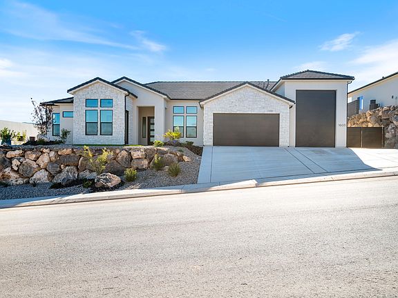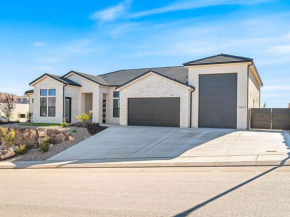 Boasting 10' ceilings and a welcoming fireplace with floating shelves, the interior is both inviting and spacious. The kitchen features a striking contrast of warm, bright cabinetry paired with dark fixtures and finishes, creating a perfect balance of elegance and modern style. The primary bedroom is generously sized and highlighted by a stunning A-frame vaulted ceiling, transitioning seamlessly into the regal primary bathroom, complete with a freestanding tub and a large walk-in closet. Beautiful guest spaces are designed with quality fixtures and finishes, ensuring comfort and style. Upon entering from the garage, you'll be greeted by a thoughtfully designed drop zone—perfect for backpacks, bags, groceries, and more. And speaking of the garage, it includes an RV garage that offers plenty of room for your toys and gear. Recently completed backyard landscaping enhances the home's appeal, featuring lush astro turf, a cozy gas fire pit, and a lowered block wall that opens up to breathtaking views of the surrounding mountains.