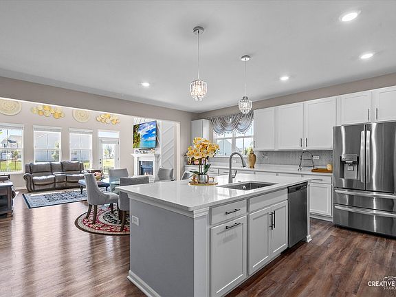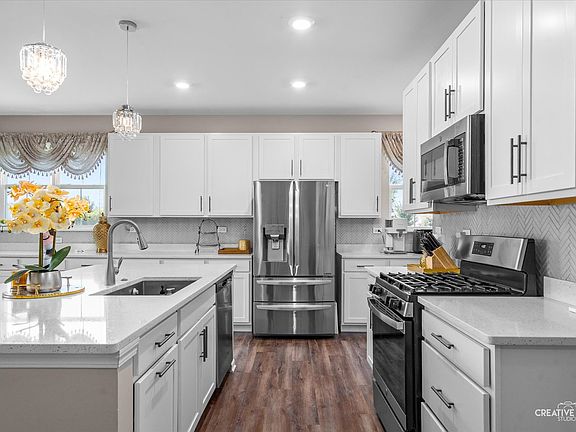 Welcome to desirable Creekside Crossing subdivision. Chefs dream kitchen designed with space, style, and efficiency in mind. This modern kitchen features stunning White Quartz countertops, all stainless-steel appliances, White 42" Aristokraft cabinets, an oversized island with sink and breakfast bar, a butlers pantry and walk-in pantry! The kitchen also opens to the two-story family room with fireplace surrounded by feature wall. Stunning and versatile dining room off of the foyer. Main level bedroom includes ensuite bath & walk-in closet, ideal for guests and in-laws. Three additional spacious bedrooms on 2nd level. Primary bedroom with large ensuite bath and oversized walk-in closet. Additional bedrooms share Jack and Jill bath. Additional highlights include 9' ft First floor ceilings, Shaw Vinyl Plank flooring, 30 year Architectural roof shingles. Smart Home features include Ring Video Doorbell Pro. Fenced yard with brick paver patio including seating wall and fire pit. Cost saving solar panels! Plainfield School district with Plainfield North High School. Close to Downtown Plainfield Entertainment and Shopping, Rt 59 corridor and I-55.