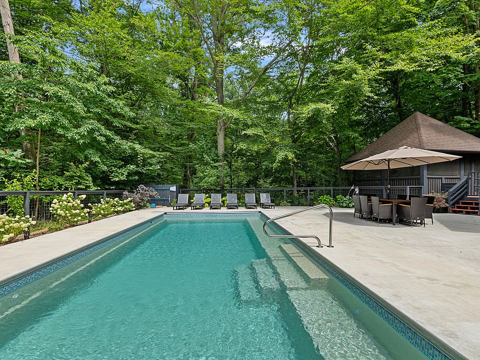Set on a 1.25-acre wooded lot less than two miles from Townline Beach, this luxurious home is FULLY FURNISHED! The open design of the living room, dining room, and kitchen, high ceilings, majestic stone fireplace, and natural light draw you in. Elegant furnishings and stylish decor, plus a pool, huge deck, and screened gazebo invite you to relax. Gather around the kitchen's large center island or breakfast nook for coffee. Relax by the outdoor fireplace and count the stars.