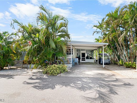 MOTIVATED SELLERS. YOU OWN THE LAND WHICH MEANS NO LOT RENT. This beautifully well-maintained home is located in 55+ in Tamiami Village. Tamiami Village is a desirable community to live in & has low monthly fees. The 2 bedrooms & 2-bathroom home is surrounded by Areca Clump Palms for wind protection. Your new home has so many upgrades to include and does come partially furnished. As you walk into the home you’ll enjoy the vinyl plank flooring throughout, replaced down to the floor joists. The spacious kitchen has been remodeled with shaker cabinets, corner cabinet Lazy Susan, microwave, custom built pantry with sliding shelves & a solid surface with ample counter space. The kitchen sink has reverse osmosis. Home has Quality Kohler plumbing fixtures & Whirlpool appliances. Both bathrooms have been custom remodeled. The guest bath has tile flooring, subway tile with accent tile & seat. Remodeled vanity, updated lighting, glass shower doors, & medicine cabinet. The master suite & bath have quartz countertop, twin medicine cabinets, glass doors, double sinks with updated lighting, subway tile with accent tile & seat. The master suite has a large walk-in closet and double door sliders, & plenty of room for king size bed & furniture. The guest bedroom has walk-in closet and double door sliders & room for furniture. Bahama shutters are on the outside of the home, some windows have hurricane panels, & plantation shutters are inside. Leaf Filter Gutter Guards installed, transferable warranty. No more cleaning out gutters ($5,000 cost). No lawn to mow because decorative stone instead of hiring a lawn service, big savings. Reinforced ceiling beams in the carport. 13,000-watt Duramax generator included with the sale of the home. New breaker box ($4,000 cost). Laundry room and sunroom have permanently vented air conditioners, and ceiling fans. AC is 5 years old & serviced by Ellsworth. AC has UV lights to keep coils clean. Yearly AC maintenance has been done on the home & monthly subterranean termite prevention. Duct work underneath the home was done in July 2024. This home has plenty of storage & closet space. Relax in your Florida sunroom or your screened in lanai enjoying your lush tropical landscaping.