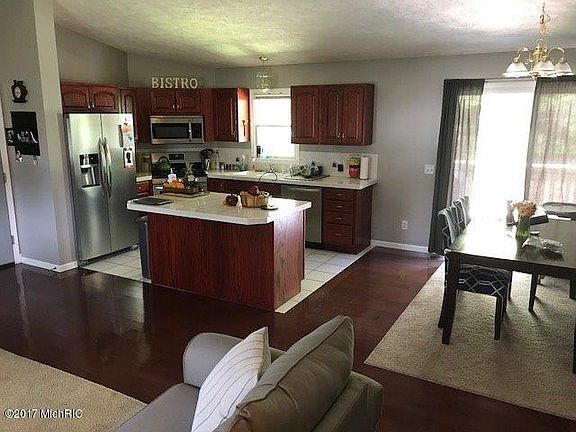 Don't miss this well cared for move-in condition home in popular Spring Lake school district! Large Great Room floor plan with cathedral ceilings and rich Cherry Flooring. Three bedrooms and two full baths. Nicely appointed kitchen with ceramic flooring and center island. Second large living area in the lower level with 9' ceilings and a walk-out door to the back yard. Dining room with sliders to an elevated deck overlooking a private back yard, great for relaxing after a long day. Refriger ator, stove, clothes washer and dryer included with acceptable offer. "Nest" energy efficient thermostat for heating and cooling. Conveniently located near Jeffers Elementary School and playground. Buyer to verify all information.