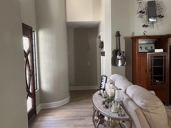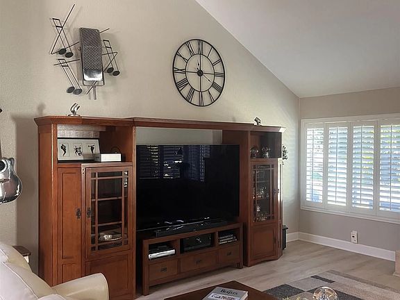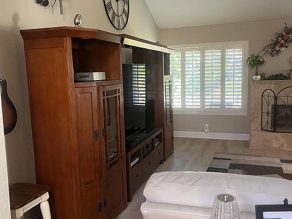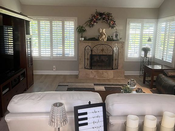 Beautiful highly upgraded home. $40,000 in new upgrades last couple months of 2024 alone. As you drive up notice the custom Pavers in Driveway, artificial turf stamped concrete entry, Stunning leaded glass double doors with leaded sidelights. Enter the Great Room with Soaring vaulted ceilings, custom Travertine Fireplace, quality vinyl windows, Plantation shutters, Luxury vinyl flooring, Decorator Paint, artistic lighting Custom 6" baseboards throughout. Kitchen boasts Thomasville Cabinetry with pull out shelves, Stainless Appliances, Skylight, Granite Counters, Pen Lights, Nook off kitchen expands the space for added dining, office, sitting area. ceiling fan, mirrored wall, coffered ceiling and 4"x88" pantry. Back yard boasts a high lush bank with variety of plants, huge trees and very large palm trees which creates privacy and a rare, beautiful, Garden Setting. Enjoy this California style oasis while relaxing and entertaining on the charming patio, artificial turf, custom hardscaping Artificial turf in front and back yard and beautiful palm trees. Storage Shed in side yard, Garage has coated flooring and overhead storage.