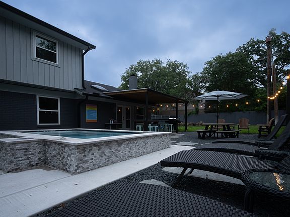 Shaded by 4 PM, the fully fenced yard features a year-round plunge pool with jets, sun shelf, and heating up to 85 degrees in winter. Lounge on 4 sun loungers or gather at the picnic table for 8 under an umbrella. Light up the firepit with seating for 4, and enjoy outdoor dining at the covered eat-up bar with seating for 4, plus an additional table for 8. The backyard is perfect for fun with yard games like Ladder Ball, Giant Connect 4, and Cornhole. With seating for 25+, this outdoor space invites you to relax, play, and make memories together.