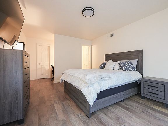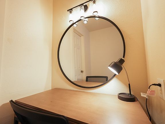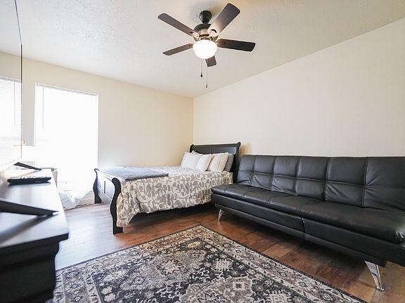 Welcome to this fully furnished 3-bedroom, 2-bath home. The living room is spacious and bright, with a sliding glass door that leads to the backyard. Next to it, you'll find a weight room with workout equipment and a treadmill, as well as an open sitting area for relaxing or greeting guests. The kitchen is fully equipped with stainless steel appliances and a coffee bar. The primary bedroom features its own work area, private bathroom, and direct access to the patio. The second bedroom includes a large TV and cozy couch, while the third bedroom has a desk and a roomy closet. A second bathroom is available for convenience, along with a laundry area that comes with a washer, dryer, and extra supplies.