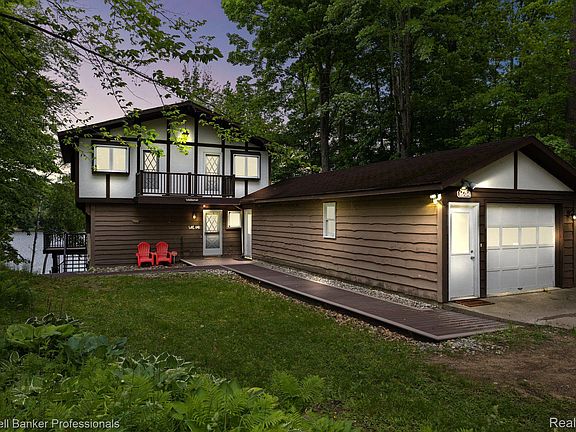 184'lake frontage of All-Sport Big Lake in Gaylord! Immaculately maintained 4 bedroom 4 bath three level Chalet style home nestled in a lovely park-like setting with beautiful new composit decking to enjoy the stunning lake and wooded views. Complete with 2 wood burning fireplaces, 2 family rooms, updated kitchen with newer floors, backsplash and granite counter and appliances, fully remodeled wet bar with granite counter, fully finished walk out lower level with spacious family room (wood burning fireplace) , new bath and fourth bedroom with egress window. Enjoy the open concept main floor with wood burning grand stone fireplace with new mantel and walk out to your extra large raised patio to extend your living space. The upper level houses the expansive primary suite complete with en suite bath, vanity, walk in closet, and private balcony as well as two other bedrooms (with private balconies) and a full bath. New attic insulation and roof in 2022, Newer zoned boiler and water heater. Septic pumped and inspected in 2022, chimney inspected in 2022, New built in microwave in 2024. The lake is clear spring fed 80' feet at the middle with sandy lake frontage. The lot has peaceful woods as well as a beach area and sun deck. Dock, and most furniture/housewares included. Nothing to do but move in and enjoy the lake!