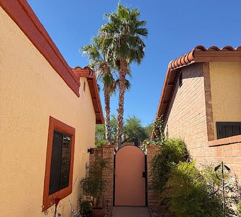 Fully walled courtyardCustom front gateExterior paintPrivate settingAmple storage spaceZero lot lineCitrus trees