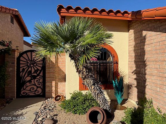 A custom front gate opens to a fully walled courtyard of this zero lot line single family home with an office/den as an extra. Enjoy all the recent improvements: exterior paint and recoated roof, Sept. 2025, kitchen and baths are updated as are skylights and HVAC. The 2 car garage has ample storage space and room for a golf cart or workshop. The backyard is lush with roses, pomegranate, jasmine and citrus trees. The parcel backs into a county park which creates a private setting permitting a view of three mountain ranges. Around the corner from a GVR which offers a swimming pool, gym, social, craft and art classes.