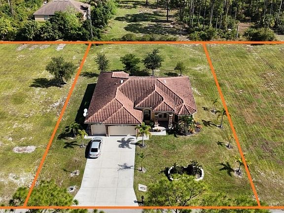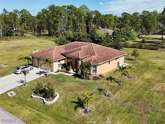 Here is what you have been looking for as your dream home, this stunning 3 bedroom, 4 bathroom home is definitely for you, every detail of this home has been thoughtfully designed for comfort and elegance. The entire house features chrome molding finishes, LED ceiling décor, and the garage includes a side door leading to the patio, as well as a small storage room, perfect for any project or future ideas you may have for the garage. Each of the spacious bathrooms features extended granite vanities, oversized mirrors, and beautifully tiled showers that reach all the way to the ceiling for a luxurious spa like feel, also the 4th bathroom is perfect for visitors leaving each other bedroom to have their own separate private bathroom, home is also featuring a spacious 3 car garage and over 2,300 sq. ft. of living area. Built in 2019, this property combines modern construction with timeless elegance. The exterior showcases beautiful brick and stone accents, adding a touch of sophistication and curb appeal. Inside, you can find refined details throughout, including elegant crown molding and high quality finishes, Huge Kitchen with spacious granite counter, tall cabinets, stainless steel appliances, 2 ovens, a stainless steal range hood, that make this home truly stand out. The open floor plan and natural light create a bright and inviting atmosphere house features a lot of impact windows, and some transom windows in some of the rooms, perfect for both everyday living and entertaining. The laundry room offers both style and functionality, with granite countertops, extra cabinetry, and plenty of workspace for added convenience. The exterior of the home showcases a beautifully landscaped garden with well maintained plants that perfectly complement the elegant finishes of this stunning property. The back lanai features a beautiful paved floor and multiple access doors to the house, and it’s also prepped with connections to install an outdoor kitchen if desired. Situated on 2 acres of cleared land, this property offers endless opportunities. Originally sitting on a half acre lot, the owner purchased the adjoining parcels, now totaling three additional half acre lots, giving you room for future projects, a pool, extra parking, or even the potential to build additional homes because each parcel has their address. Right next door you will find a scenic canal, perfect for relaxing, or simply enjoying the peaceful Florida lifestyle, it is a space for endless outdoor fun. This Property is located in a rapidly growing area near sunshine and lee blvd, with plenty of shopping centers, and even more developments coming soon... offering convenience, privacy, and incredible value. Just a short drive to nearby beaches, restaurants, schools highway I-75 and 82 Road, is also not located in a flood zone, it’s rare to find a property with this combination of elegance, size, flexibility and price.