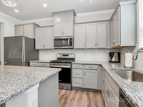 Like-new 3-bedroom, 2.5-bath end-unit townhome with finished 1-car garage and private views! The open layout features stylish LVP flooring on the main level, a spacious gathering room, and a stunning kitchen with gray 42” cabinetry, stainless steel appliances, a large center island with seating, and a sunny breakfast nook. The main floor also includes a generous storage area. Upstairs, wrought-iron railings lead to three bedrooms plus a versatile loft. The owner’s suite offers a spa-like bath, while the private patio is perfect for outdoor relaxation.