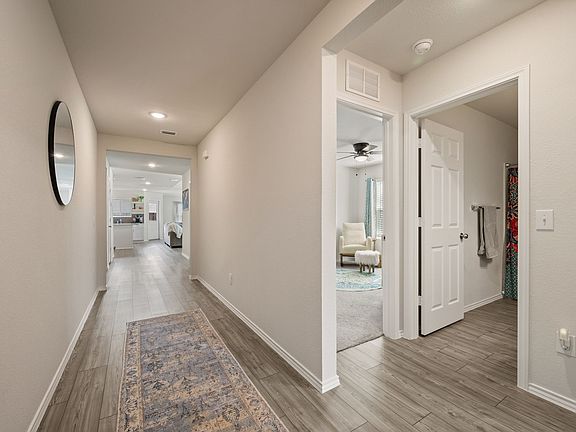 Laminate wood floorsOpen and spacious designCozy carpeted bedroomsWhite cabinetsGold hardwareSplit-bedroom layout