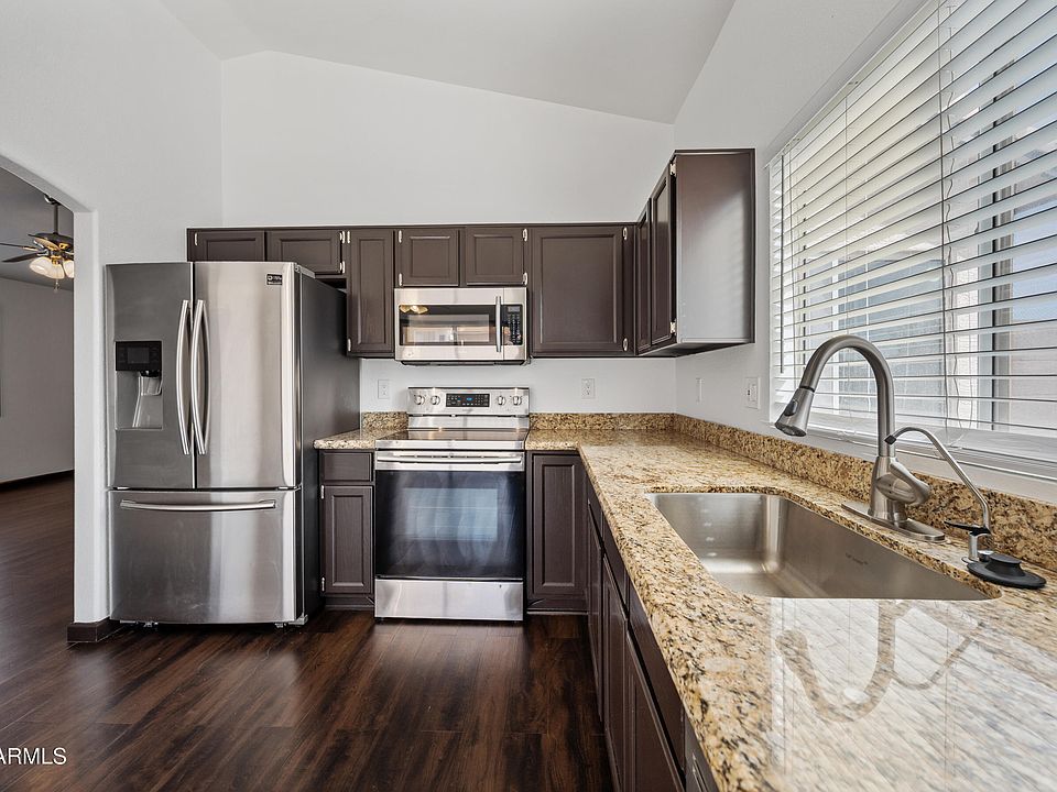 Welcome to your perfect haven in 85048! This 3-bed, 2-bath beauty features vaulted ceilings, hardwood & tile floors, neutral paint, and stylish upgrades throughout. The open floor plan includes SS appliances, remodeled baths, and ceiling fans in every room. The spacious primary suite offers double sinks, separate tub/shower, walk-in closet, and private patio access for morning coffee. Step outside to your own retreat with a sparkling pool, extended covered patio, and low-maintenance desert landscaping. Pride of ownership shows in this immaculate, move-in ready home — don't miss it!