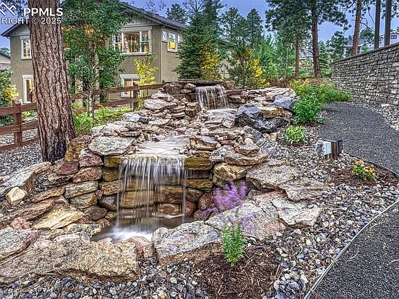 Truly upgraded and meticulously maintained rancher located on a peaceful cul-de-sac in the sought after Sanctuary Pointe community. Perfectly positioned on over a quarter of an acre w/ towering Ponderosa Pines, great privacy and views of the mountains make this the Colorado dream! Popular Oakridge model built by Vantage Homes w/ over 4,100 sq ft, 4 bedrooms (2 main level), 4 baths, 3 car garage. The main level flows flawlessly, flooded w/ natural light from large windows and was designed with entertaining at top of mind. Real oak hardwood floors throughout the main level, modern metal railings and 10 ft ceilings throughout. The great room has 12 ft ceilings, gas fireplace, a wall of windows and double doors to truly bring the outside in. Phenomenal kitchen with gorgeous Quartz counters, black stainless appliances, gas cook-top, double oven, sizable pantry, large island, stylish hardware and dining surrounded by windows peering out into the tree tops with mountain views between. Main level primary suite w/ spacious walk-in closet that enters the laundry, two bathroom vanities w/ additional cabinetry, over-sized spa shower w/ stone bench and seamless glass surround. The grounds are lush and professionally landscaped. Cascading waterfall and pond next to the paver patio w/ gas firepit is the perfect location to take in nature and unwind. Multiple outdoor entertaining spaces - covered main level composite and metal deck, lower level patio and two separate paver patio spaces. Finished walk-out lower level w/ 9 ft ceilings, two additional bedrooms, a bath and a huge family room/game room w/ future wet bar rough-in plumbing. Mere minutes from I-25, Highway 83, Air Force Academy and the amenities and shopping of Monument. Easy commute to Colorado Springs or Denver. Award winning School District 38. The community offers beautiful outdoor recreation opportunities w/ wooded trails that connect to the 400+ acre Fox Run Park Regional Park and two community parks.