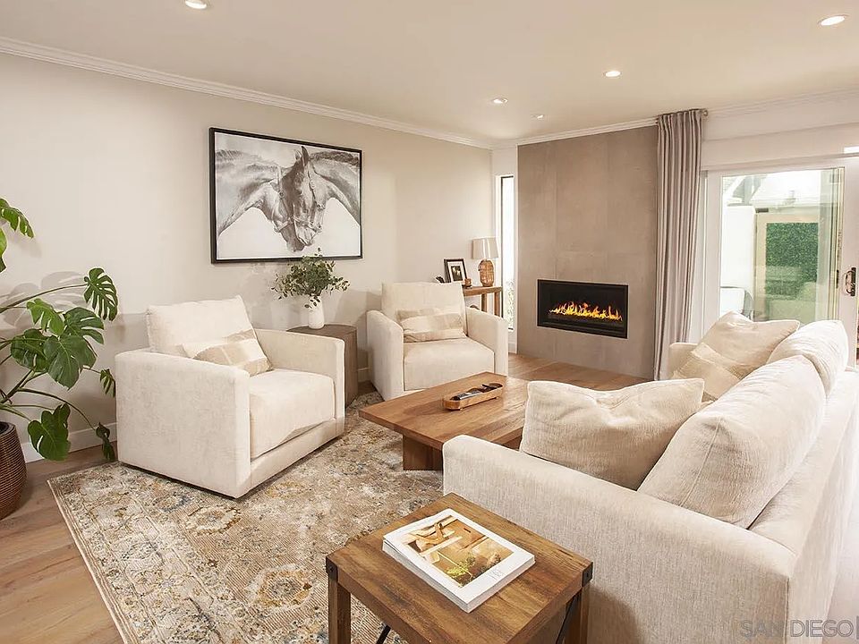 Stunning turn-key Rancho Santa Fe Whispering Palms home. Steps to Morgan's Run Golf Club & Resort and shops. Flooded with natural light, extensively updated with gorgeous French Oak wood flooring and designer finishes. Entry level bedroom, primary and junior suites upstairs with vaulted ceilings and walkin closets. Private zen patios for indoor outdoor living. Lives like a detached home with HOA maintaining the exterior, front landscaping, and roofs. Complete with two car garage and community pool.