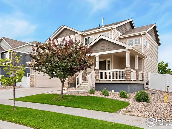 Water views from all West facing windows! On the West end of town, surrounded by nature and walking paths and only minutes from Centerra, buyers will find this tastefully appointed home built in 2022. With unobstructed views of Promontory park and pond, along-with multiple upgrades. Enjoy the privacy of the unencumbered backyard, where a large 31' patio was added for entertaining or relaxing while taking in the glistening water views and sunsets each night. Inside you'll find expansive vaulted ceilings, kitchen w/walk-in pantry, sand colored LVP floors, a 5-piece ensuite as well as two covered patios and a bright 3 car-tandem tall enough for a lifted pick-up. The kitchen also includes new soaring 42" soft close alder wood cabinetry, Calcutta quartz counters with a crisp white picket backsplash and high-end appliances. If condition and esthetics are priorities, there's much to appreciate about this beautiful home! Move-in ready, with plenty of storage and an unfinished basement. Easy access North or for a Denver commute. Schedule a showing at sunset and experience the sun-lit, majestic backdrop for yourself.