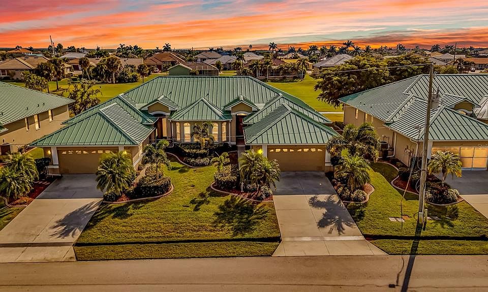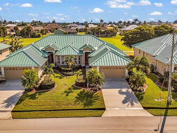 Welcome to the Villas of Versailles, a beautifully maintained community set along the fourth fairway of the private St. Andrews South Golf Club. With a low monthly HOA of just $350 and exceptional upkeep throughout the neighborhood, this villa offers comfort, convenience, and true Florida living. This meticulously maintained three-bedroom, two-bath home has had only one owner, and furnishings are optional for those seeking a turnkey opportunity. Major updates include a new standing seam metal roof (2023), air conditioning system replaced in 2019, water heater (2018), reverse osmosis system under the kitchen sink, and a whole-home water softener installed in 2022. The home is also equipped with storm shutters for added protection and peace of mind. The property includes a transferable flood insurance policy and has never sustained flooding. Inside, the villa features a generous living area with excellent natural light, a formal dining space, and a third bedroom currently used as an office with an attractive view toward the main living room. The attached two-car garage, recently serviced irrigation system, and well-manicured landscaping add to the home’s appeal. Step outside to a private patio overlooking beautiful golf-course views and enjoy stunning west-facing sunsets thanks to the villa’s ideal southern exposure. Residents of the community enjoy access to a lovely pool and recreation room. The location is unbeatable—just minutes from downtown Punta Gorda, with easy access to biking, boating, kayaking, shopping, dining, and all the amenities that make the area so desirable. This villa blends quality updates, scenic views, storm protection, and a prime golf-course setting in one of Punta Gorda’s most sought-after neighborhoods.
