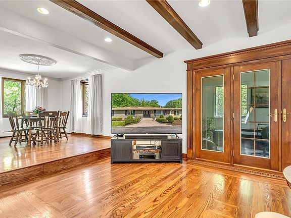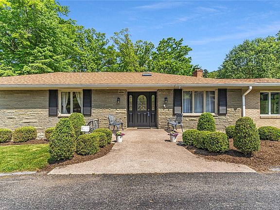 A governor's driveway leads to this sprawling all-brick ranch with more to offer than meets the eye! Greet guests in the level entry boasting natural light from the skylight. A sunken living room with exposed wood beams will be a favored gathering place. Glass French doors lead to the den featuring a fireplace. The updated kitchen with granite countertops opens to the dining room, perfect for hosting dinner parties. This home offers hardwood floors and is freshly painted throughout. Four bedrooms and one full bath accompany the main floor. A finished game room with an impressive wet bar, an updated second bath with a huge standing shower, and laundry can be found on the lower level. Ample parking with the two-car garage. Relax on the covered deck off the kitchen with extra storage beneath. The outdoor space is perfect for summer enjoyment including an inground pool, patio, and storage shed that could double as a tiki bar! Located near the elementary school, Hartwood Acres, and Route 8.