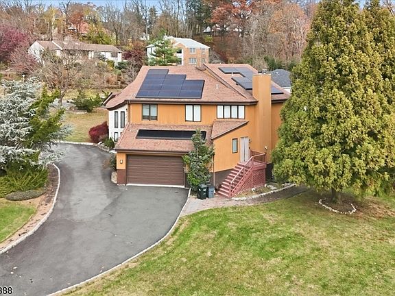 Welcome to The Woods of Mountainside, this contemporary home blends style and functionality with 5 bedrooms and 3.5 baths across multiple levels, . The first floor features a grand entry leading to a vaulted living room with a second-floor overlook and leads into the formal dining room. The kitchen opens to a deck with private backyard views, and the adjacent family room, with wood-burning fireplace and large projector screen with additional access to the deck through sliding doors. Upstairs, the hallway overlooks the family room and leads to four bedrooms, a full main bath with soaking tub and shower, and a primary suite with spa-like bath, soaking tub, separate shower, and private balcony. The basement is accessible via garage stairs, offers high ceilings, a recreation room, gym with sauna, utility room, and storage/wine cellar. A private in-law suite includes a living area with kitchenette, bedroom, full bath, and exterior entrance.Additional highlights include owned Tesla solar panels, two-zone HVAC with Honeywell smart thermostats, and a 200-amp all-in-one panel with Square D backup load center. Enjoy easy access to NYC via Route 22 bus service, top-rated blue ribbon schools, the Watchung Reservation, Trailside Museum, Watchung Stable, major highways, and within close proximity to Newark Airport.