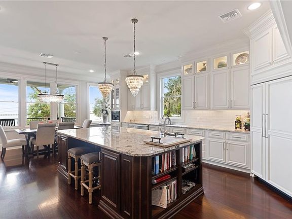 IMPROVED PRICE!!! BREATHTAKING LAKE/SUNSET VIEWS IN HISTORIC OLD MANDEVILLE, minutes from the Causeway. Deep covered porches front & back. Rear of home has views of wildlife sanctuary. Open concept for entertaining, professional appliances, walk-in pantry, walls of windows w/motorized sheer shades, circular dining room, curved staircase w/ custom iron rail. Primary bath has walk-through shower with view. New paneled elevator services 3 levels. Media room w/kitchenette leading to 2nd floor private balcony. Private office with lake view. Workout room or 2nd office / swing room. Have coffee with the egrets in the morning and wine with the sunset in the afternoon. Living at its finest. OWNER/AGENT.