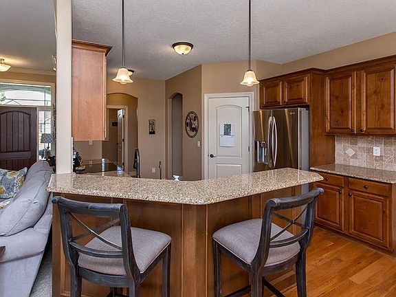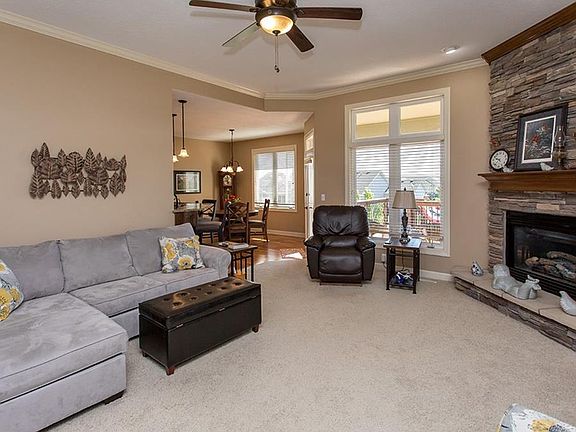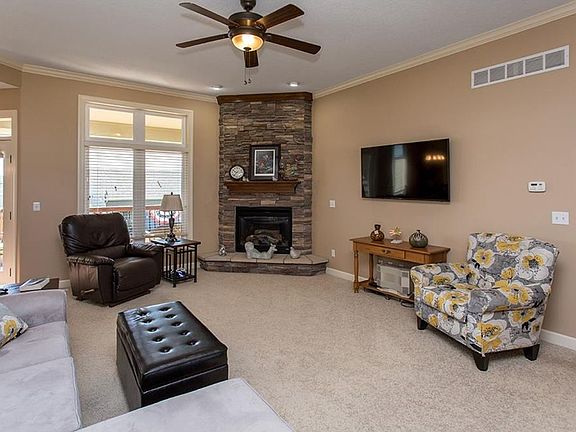 Welcome to this stunning walk-out ranch in desirable Grimes neighborhood. Lovely curb appeal w/ abundant professional landscaping. Open entry area opens to beautiful living room featuring crown molding and a corner fp with fl to ceiling stone work. Beyond the living room is the dining area and kitchen w/ hardwood floors. Beautiful kitchen includes ample cabinetry, granite counters, tile backsplash and stainless steel appliances. Master suite features a tray ceiling, walk-in closet & bathroom with dual vanities, jet tub and shower. Main level features two additional bedrooms, another full bathroom with dual vanities and a mud/laundry room. Finished walkout lower level is ready for entertaining!! There is a theater area, room for a pool table and an amazing bar w/ beautiful woodwork and room for seating. 4th bedroom and another ba w/ fully tiled shower. Large elevated deck leads down to oval shaped patio with a built-in outdoor fireplace. Great valueâEUR¦priced below assessed value!