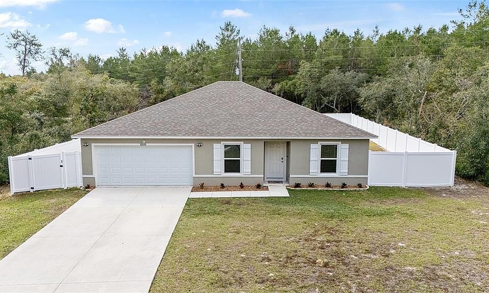 Beautiful 3/2/2 home built in 2022! PRICED BELOW RECENT APPRAISAL! IMMACULATE and move-in ready! OVERSIZED lot (.29 acre) with privacy fenced back yard! This concrete block home is spacious with 1572 ft living space! OPEN FLOOR PLAN with luxury vinyl plank flooring throughout. Great room has sliders that open to the large back yard. Kitchen has breakfast bar, SS appliances, pantry, plenty of cabinets/counters, and opens to the dining room. Another front room can be used as a den, formal living room or office. SPLIT BEDROOM. Primary bedroom has ensuite with walk-in shower, make-up vanity area, and walk-in closet. Inside laundry room includes the washer/dryer. Great backyard area has a fire pit and privacy with fence and no neighbors. Water softener included. Peaceful neighborhood ~ convenient to shopping, dining, parks, and I-75!
