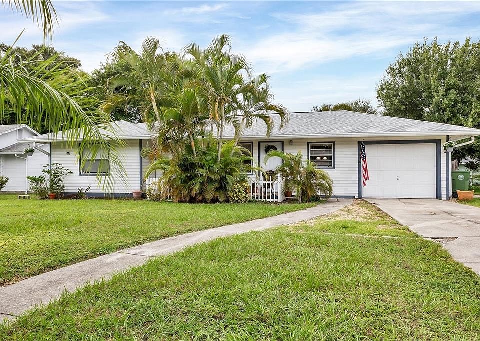 This West Bradenton home is located within easy walking distance to Manatee High School and is priced to sell! Enjoy a split plan offering 3 bedrooms, 2 bathrooms and a one car garage. An open wood deck area landscaped by Adonidia palms for added privacy welcomes you as you arrive at the front entrance. The kitchen which offers granite countertops, pots and pan drawers, stone backsplash, maple cabinetry and a barstool counter area leads to a cozy dining room/breakfast nook that could easily function as an office. Flooring includes tile on the diagonal in the main living areas, laminate flooring in the Primary Suite and carpeting in the two bedrooms. French doors lead to the large fenced in backyard where you can enjoy relaxing in a tropical garden area bordered by birds of paradise plants and palm trees. A paved patio areas is perfect for your bbq cookouts and makes for easy entertaining. Little ones and pets are sure to enjoy the nicely sized fenced in backyard where they'll have plenty of room to romp and play. This property offers plenty of space to accommodate a swimming pool. Enjoy the savings of having a 2022 Rheem water heater, 2022 roof and 2017 A/C with newer ductwork. This is a charming home just waiting for its new owners to claim it!