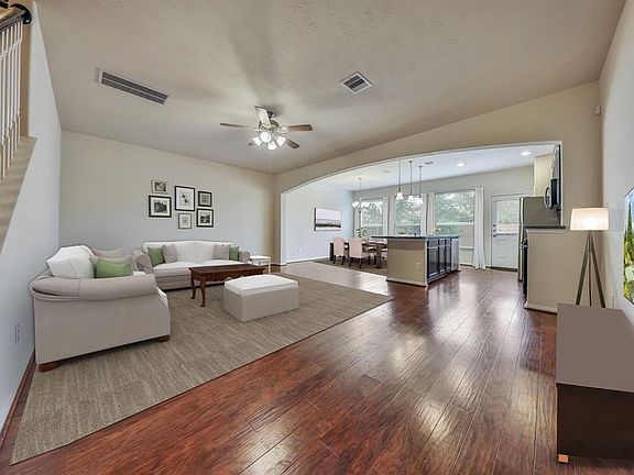 Stunning, contemporary townhome located in the gorgeous master planned, golf course & equestrian community of Gleannloch Farms, complete w/ recreational center, clubhouse, riding trails, barns & stables. A combination of stone and brick exterior welcome you to an elegant entry w/ upgraded finishes throughout, featuring granite counters, engineered wood floors, stainless steel appliances, half bath downstairs, water softener, island kitchen w/ custom built hanging pot/decorative rack overlooking eat-in breakfast and living area, perfect for entertaining guests. Upstairs you will find 3 bedrooms, 2 full baths and second living area that could also be used for media and/or game room. Master bedroom features ensuite bath with double vanity and HUGE walk in closet that also has a window for natural light. Very private covered patio with no rear neighbors. Excellent Klein ISD.