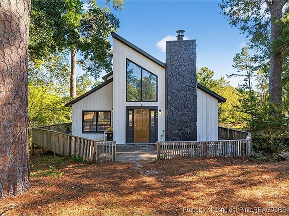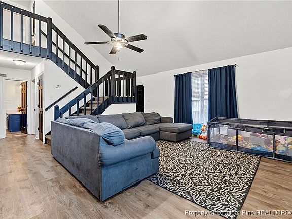 This bright and inviting home features vaulted ceilings and tall windows that fill the living spaces with natural light. Laminate floors run throughout the main living areas, creating easy-to-maintain spaces for everyday living. The primary bedroom and bathroom are conveniently located on the first floor, with two additional bedrooms upstairs—each offering large closets and plenty of space to unwind. Enjoy the outdoors on a large grassy lot that's perfect for relaxing, gardening, or play. Conveniently located less than 10 minutes from Fort Bragg and just 5 minutes from groceries and shopping, this home offers the perfect balance of comfort and convenience—and you can't beat that price! Don't miss your chance to make this one yours-schedule a showing today!