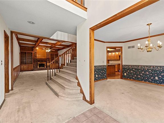 Hurry and make this beautiful home your own! This 1 1/2 story home has four bedrooms, a formal dining room, office/den space, living room, rec room, eat in kitchen, two fireplaces and even a sauna! The wooden beams in the living room add elegance to the home. The large deck is a great place to enjoy a cup of coffee in the morning or a beverage at night. There is a large backyard backing to trees and a third garage in the lower level of the home. Hurry and don't miss out!