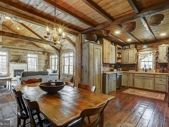 THIS PROPERTY IS GOING TO AUCTION ON WEDNESDAY JUNE 4, 2025 @ 6:00 PM. THE LIST PRICE ONLY REFLECTS THE SUGGESTED STARTING BID. Completely renovated "Log Cabin" style house while keeping all its history charm including a 3-year old addition integrated into the same time period. It feels like a museum but includes all the current comforts to make it more day-to-day friendly. The original part of the house was built between 1790-1800 with a later kitchen addition and third spacious addition in 2022, it's like stepping back in time. Kitchen/dining cabinetry incorporated old cupboards and wooden boxes to fit the time period, includes all stainless steel appliances. 2022 great room addition is post/beam construction, fireplace mantle, 15' cathedral ceilings, powder bathroom, adjoining room with remarkable walk-in original stone fireplace, living room with log walls, laundry room with sink. Inviting front and rear covered porches, 20' x 6' rear concrete patio. Second level has 3 bedrooms, landing area, primary 11.5' x 9' walk-in closet, full bathroom with shower. Two new heat pumps and A/C in 2022, central vac. Detached garage is a concrete block 28' x 40' garage/shop, plenty of room for vehicles. 1-12' x 9' overhead door and 1-9' x 7' overhead door, concrete floor, electric service. This is a rare opportunity to live in a "Log Cabin" style house restored in all its glory with modern amenities for luxury living. Property has a large pond beside the road so the buildings can set back away from traffic. Truly a must-see property if you enjoy the "Late Revolutionary" part of American history.