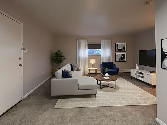 The living room features high windows that allow natural light to filter in, creating a brighter atmosphere. Neutral-toned walls and carpeted floors throughout contribute to a cohesive look. Sliding closet doors in the bedrooms offer convenient storage solutions.