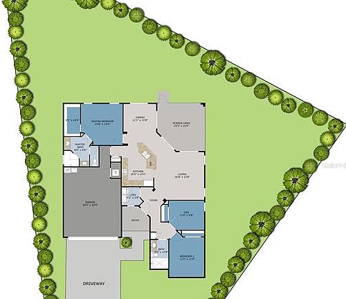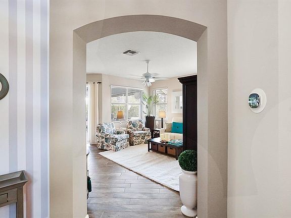 Welcome to your private retreat in the Village of Mallory. This elegant Camden Designer Home, crafted with CBS construction, is ideally positioned at the end of a quiet cul-de-sac on an expansive 10,000+ square foot pie-shaped homesite. With no homes behind and serene views backing to O’Dell Circle, the setting is unmatched for privacy and tranquility. The approach is warm and inviting, framed by lush landscaping, a two-tier stone fountain, solar lighting, and a stately Robellini palm that accents the welcoming front porch. The entryway sets the tone with an old-world glass front door and a charming wallpapered foyer that opens into refined interiors. Inside, soaring 9’4" ceilings create a sense of volume and light, while architectural arches, fresh paint, 5 1/4 inch baseboards, and wide-slat wood blinds enhance the home’s timeless sophistication. The main living areas are finished in durable tile, complemented by newly installed neutral plush carpet with upgraded padding in the bedrooms. The layout is thoughtfully designed with a split floor plan: the owner’s suite offers a grand walk-in closet and a spa-inspired bath with dual granite vanities, chandelier lighting, an oversized tile shower with built-in seating, and carefully upgraded fixtures. Guests are treated to their own private wing with two additional bedrooms and a full bath, ensuring both comfort and privacy. The chef’s kitchen is as functional as it is beautiful, featuring gleaming granite countertops, maple cabinetry with updated hardware, upgraded appliances, a pantry closet, convenient pull-out shelving, and a spacious bar counter that opens seamlessly to the dining and living areas. Designer chandeliers, recessed lighting, and upgraded Kichler ceiling fans throughout the home complete the elegant interior ambiance. A brand-new GE washer and dryer with upper cabinetry enhance the well-appointed interior laundry room, while an oversized two-car garage with pull-down attic stairs and storage space adds practicality. The true crown jewel of this home is its outdoor living space, which was featured on the cover of Villages Magazine and celebrated in an article on entertaining. A heated T&D swim spa pool, with both solar and gas options, is surrounded by an enlarged Mansard-screened lanai with cross bracing, roller shades, multiple lounging and dining areas, and outdoor TV wiring. The northeast-facing orientation captures soft morning and early afternoon sun, creating the perfect setting for gatherings. Mature oaks, magnolia trees, and specimen palms encircle the lanai, blending natural beauty with a private resort feel. Every detail reflects thoughtful updates and pride of ownership, including a new architectural shingle roof in 2014, a new HVAC system with Ecobee thermostat in 2021, tinted double-pane windows for comfort and privacy, upgraded light fixtures and chandeliers throughout, newly installed smoke detectors, and gutters encircling the home. The result is a residence that blends elegance, practicality, and the very best of Florida living. This is more than just a home—it is an entertainer’s showcase, a private sanctuary, and a statement of refined living. With its premier location, soaring ceilings, magazine-worthy outdoor spaces, and a rare blend of privacy and style, this home stands as one of the most desirable residences in The Villages.
