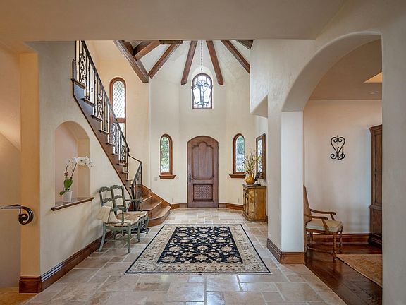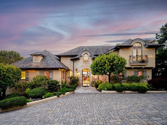 Behind a gated entrance on a coveted, quiet street, this south facing, stunning French Country residence has captivating ocean views and a mature garden. The quality of the architectural details and construction are apparent from the moment you see the hand carved arched front door and pass through the spacious entry to the living room with its hand hewn walnut floors, hand carved limestone fireplace and breath taking views. This impeccably maintained home has an effortless flow with the major living spaces on the main level, including the luxurious primary bedroom suite and one office. The lower level features a spacious family room, a wine cellar, wet bar, bonus room and a garden room next to the 3 car garage. Other highlights include 3 additional ensuite bedrooms, a gourmet kitchen, formal dining room, a large ocean-view office, a mezzanine library, unique ceiling designs, an elevator and a cistern system, and ideal location near Pebble Beach golf courses and Pebble Beach Resort.