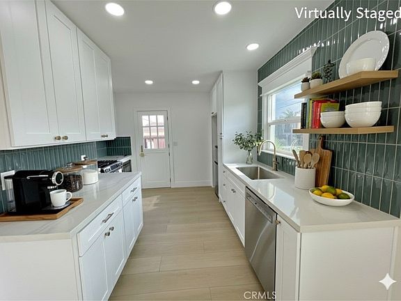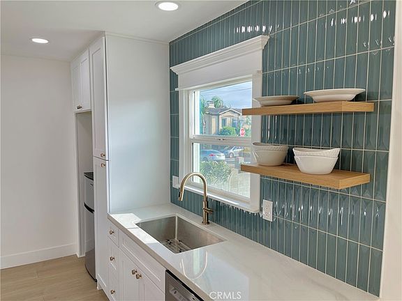 Step inside to a bright, open-concept interior featuring brand-new flooring throughout, freshly painted walls, and recessed lighting. The stunning galley kitchen is designed for both style and function, showcasing white shaker cabinetry, quartz countertops, new stainless-steel appliances, and a striking teal subway-tile backsplash that adds a fresh coastal pop of color.