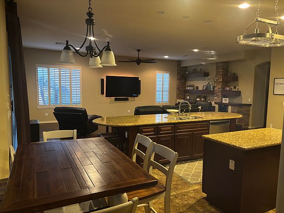 Enjoy your large backyard with partial view fence year round with heated pool and hot tub, in pool table with seating, and Baja step. Large pet turf area, BBQ area with high end infrared grill, gas firepit and putting green.