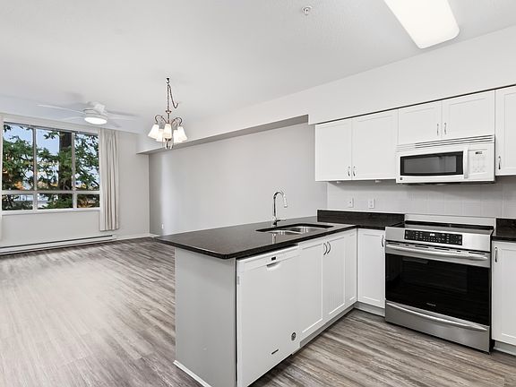 Stunning, renovated Top Floor home in Fleetwood Gardens a 55+ centrally located building.2 bedroom + den, with 2 full bathrooms, in-suite laundry, secure parking for 1 vehicle, boasting over 1000 sqft of functional living space. Natural light fills this North facing home with 9 foot ceilings and large windows overlooking trees for a picturesque setting. Home in immaculate condition with recent upgrades including vinyl plank floor, lighting, kitchen/bathroom cupboards, quartz counter tops, newer appliances including induction stove! Large primary bedroom with his & hers closet and ensuite with tub. Relax & enjoy mountain views from your large covered patio. Just minutes walk from Fleetwood Community Centre, parks, grocery stores, restaurants, and transit. Quick Possession possible!