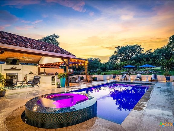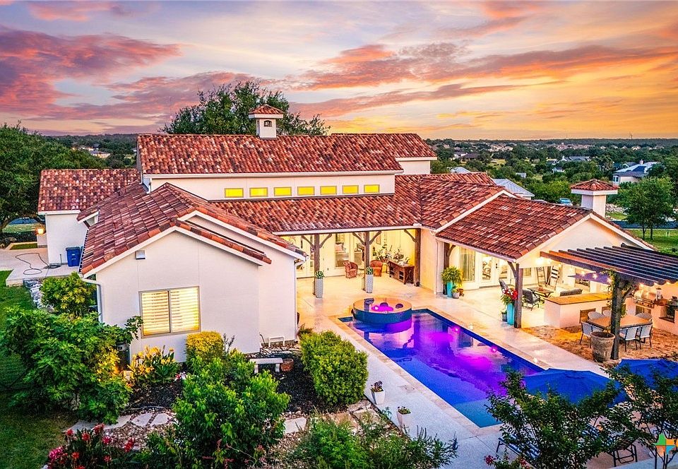 Welcome to an extraordinary Santa Barbara–style retreat in the exclusive gated Bordeaux section of Vintage Oaks, where luxury, privacy, and timeless design converge. Situated on over an acre of manicured grounds, this custom-built masterpiece offers 4 bedrooms, 3 bathrooms, a dedicated office, and a resort-inspired outdoor living space that blends seamlessly with the Hill Country landscape. From the moment you arrive, the home’s graceful architecture, creamy smooth stucco, and rich wood accents create an ambiance of refined elegance. A private, arched entry gate invites you into a serene courtyard—a perfect first impression—where lush greenery and the gentle sound of a fountain welcome you home. Inside, the open-concept layout is defined by soaring ceilings adorned with exposed wood beams, hand-troweled walls, and an abundance of natural light streaming through expansive windows. The living room serves as the heart of the home, anchored by a stunning fireplace that exudes warmth and character. Just beyond, the chef’s kitchen is a culinary dream, boasting high-end appliances, a gas range, double ovens, custom cabinetry, a sprawling center island with seating, and a walk-in pantry designed for both functionality and style. The adjacent dining area ensures every meal is served with a side of beauty. The primary suite is a sanctuary of comfort and sophistication. Featuring its own fireplace, it’s a retreat you’ll never want to leave. The spa-inspired en suite bath includes a clawfoot soaking tub, walk-in shower, dual vanities, and an expansive walk-in closet. Three additional bedrooms are generously sized, each offering comfort, style, and thoughtful design touches. A dedicated office, overlooking the courtyard, makes working from home both productive and inspiring. Step outside, and you’ll discover the crown jewel of this property: an outdoor living space designed for year-round enjoyment. A sparkling pool with a spa invites refreshing dips on warm Texas days.