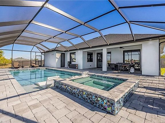 This stunning 2023-built home blends modern design with thoughtful upgrades, offering both luxury and functionality. Featuring 3 bedrooms, 3 full bathrooms, and a den, it rests on an expansive triple lot along a serene freshwater canal. Inside, the open floor plan is highlighted by soaring 14-foot tray ceilings, oversized porcelain tile flooring, sleek baseboards, and contemporary lighting that creates a warm, inviting atmosphere. The chef’s kitchen impresses with top-of-the-line appliances, a quartz waterfall island and backsplash, soft-close double cabinetry, LED accents, and stylish pendant lighting. A custom coffee bar and wine station add an extra touch of convenience and sophistication. The king-sized primary suite is a true retreat, complete with a water view, private pool access, a spacious walk-in closet with built-in cabinetry, and a spa-like ensuite featuring a frameless glass shower with dual rainfall showerheads. Designed for relaxation and entertaining, the outdoor space features a sparkling pool with a new screen enclosure, a safety fence, a jetted spa, and a fully equipped custom outdoor kitchen. A pool bath and entertainment-ready TV system make gatherings effortless, while the expansive grassy area offers room to play or simply enjoy the view. Additional highlights include a 3-car garage with epoxy floors, a property-line fence, and underground electrical service. This home combines style, comfort, and peace of mind—all in one exceptional waterfront setting.