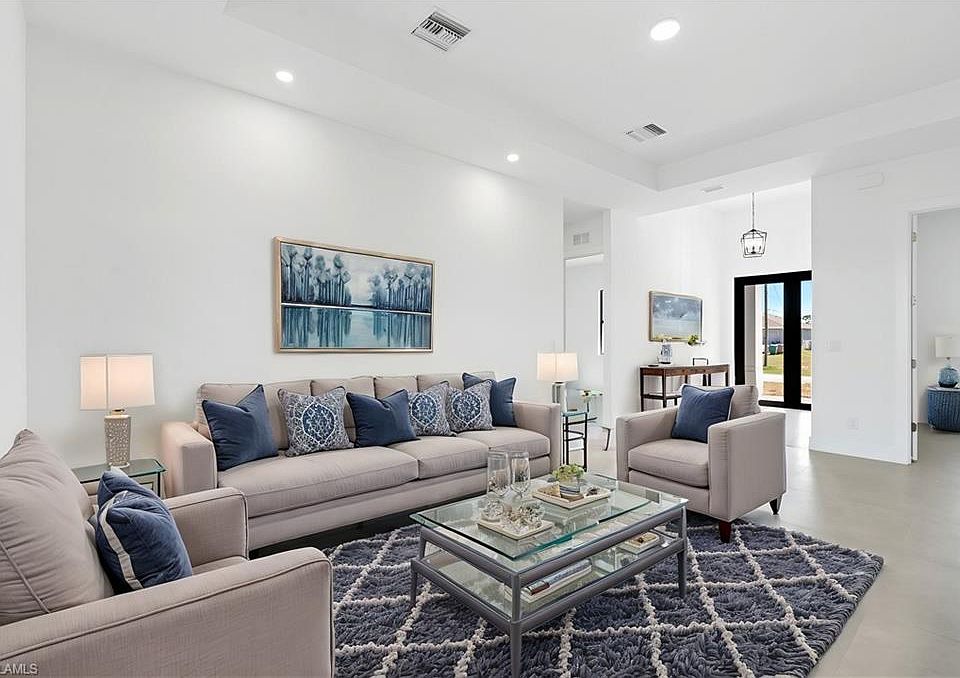 NEW CONSTRUCTION ON A CANAL! NO FLOOD ZONE! Enjoy the best of waterfront living with the perfect blend of luxury in this stunning new construction home. Featuring premium upgrades, soaring ceilings with elegant tray details, sleek tile floors throughout, high-impact windows and doors, and an abundance of natural light, this open-concept design creates a bright and spacious living area. With 3 bedrooms, a versatile den, and 2 beautifully designed bathrooms, this home offers ample space to suit your needs. The high-end bathrooms boast top-of-the-line brass fixtures and finishes, providing a spa-like retreat in the comfort of your own home. The kitchen has a large island with waterfall quartz counters, stainless steel appliances, and sleek pendant lighting - perfect for entertaining and your culinary needs. Enjoy breathtaking canal views from your backyard, offering a serene waterfront setting. The built-out laundry room includes extra cabinets for added storage and convenience. With a two car garage for your vehicles and extra storage, this home truly offers the best of both worlds—modern comfort and natural beauty right outside your door. Located just minutes from Pine Island Road, you'll have easy access to shopping, dining, and entertainment. Optional BUILDER UPGRADES ARE AVAILABLE: *Bedroom closets for $3,000* * Full lot perimeter fence and gate for $5,000* *lanai screen enclosure for $500*. Don’t miss your chance to own this exceptional home—schedule your showing today! **THIS PROPERTY QUALIFIES FOR A 1% LENDER INCENTIVE IF USING PREFERRED LENDER. INQUIRE FOR MORE DETAILS.** Photos in this listing have been virtually rendered.