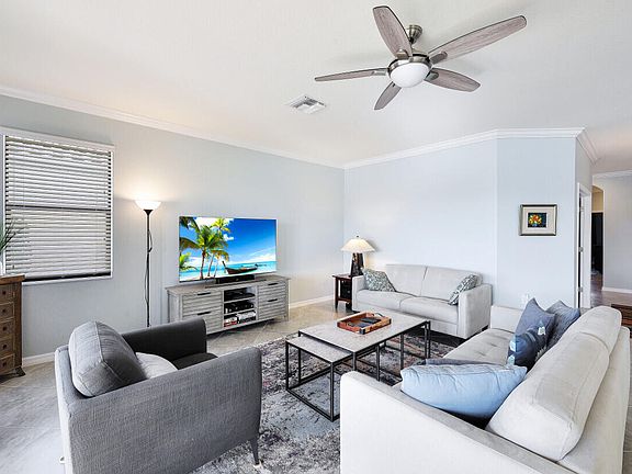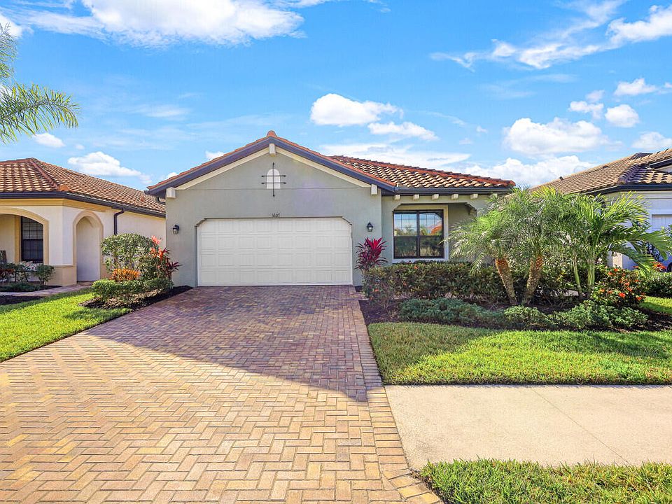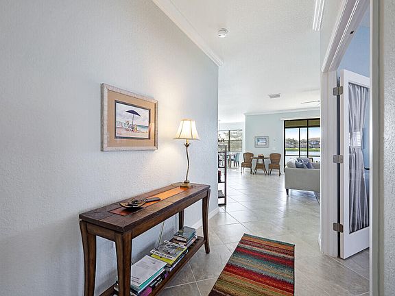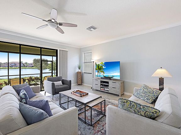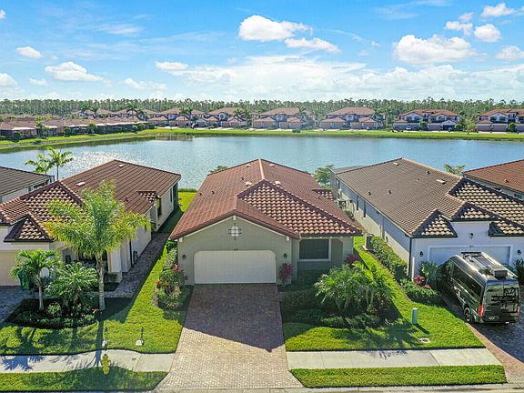 Perfect southern exposure and exceptional long and wide lake views from this 2 BR/ 2 BA plus FLEX ROOM popular Roma model built in 2018, impeccably maintained and upgraded by the original owner. This superb property features 1908 sq. ft. under air, a luxury kitchen with a massive breakfast bar, granite counter tops, stainless appliances, Bosch dishwasher, recessed lighting and a large dining area. The primary bedroom offers an en suite bath with dual vanity, a huge walk-in shower and an ample walk-in closet. The floors are dressed in deluxe block ceramic tile on-the-diagonal and luxury vinyl wood-look wide plank floors in the bedrooms. Crown moldings, a spacious lanai with Storm Smart electric hurricane screens, retractable hurricane shutters on back window, stained-glass front door, Smart thermostat, Ring doorbell, contemporary light fixtures and ceiling fans, laundry room with added shelving and laundry tub. Artesia Naples is a low-density gated community, NO FLOOD INSURANCE REQUIRED, LOW HOA FEES, NO CDD, on-site management, clubhouse, community pool, fitness center, theater and dog park. New pickleball courts and bocce coming soon. Just minutes to Naples and Marco Island beaches!